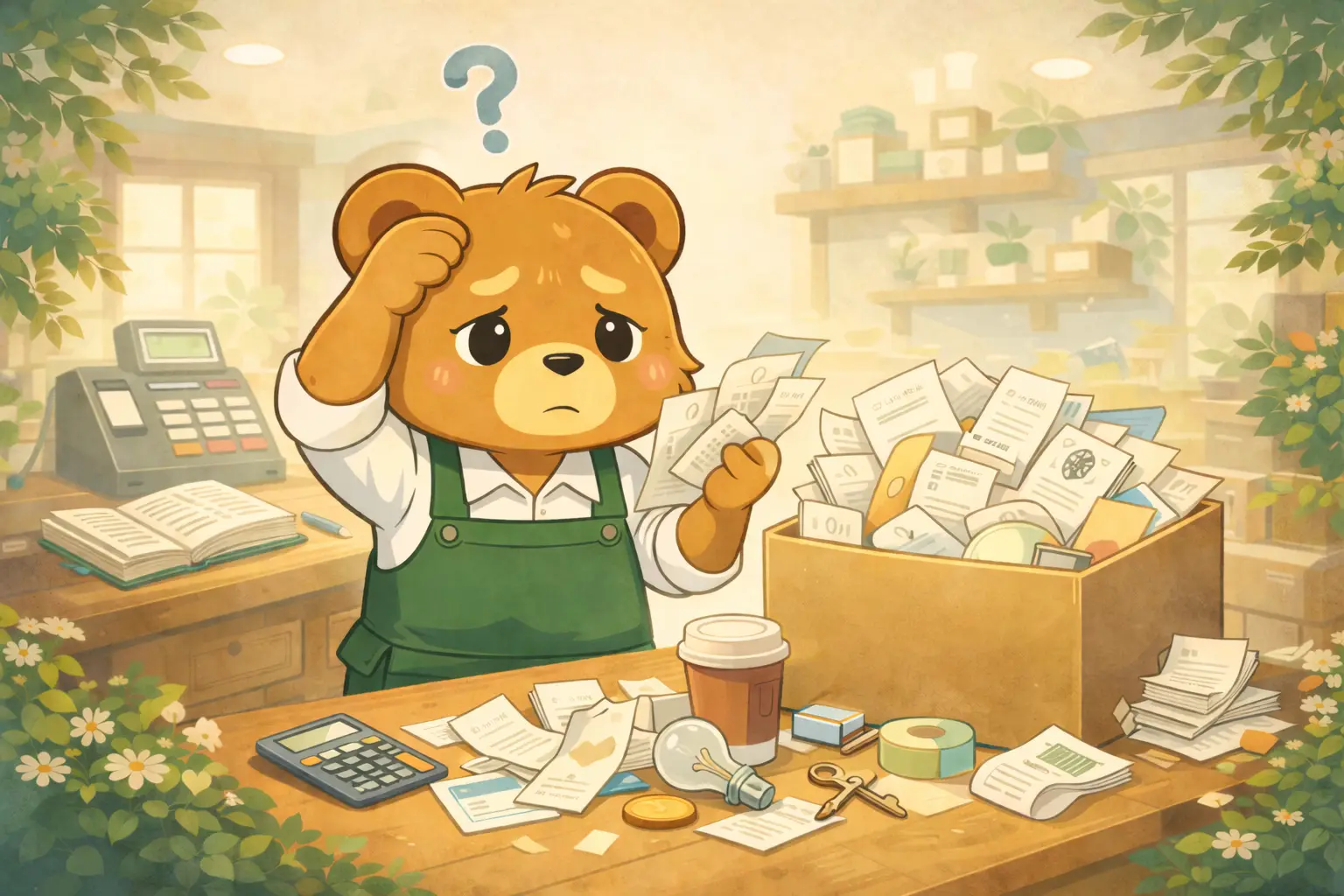 ある日の午後、こぐまさんはレジ横の“なんでもレシート入れ”を整理していました。